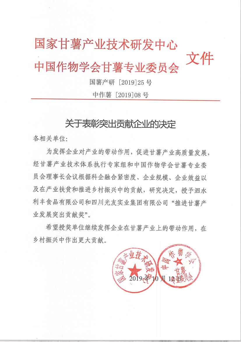 熱烈祝賀泗水利豐食品有限公司被國家甘薯產(chǎn)業(yè)技術(shù)研發(fā)中心、中國作物學(xué)會甘薯專業(yè)委員會授予“推進甘薯產(chǎn)業(yè)發(fā)展突出貢獻獎”。